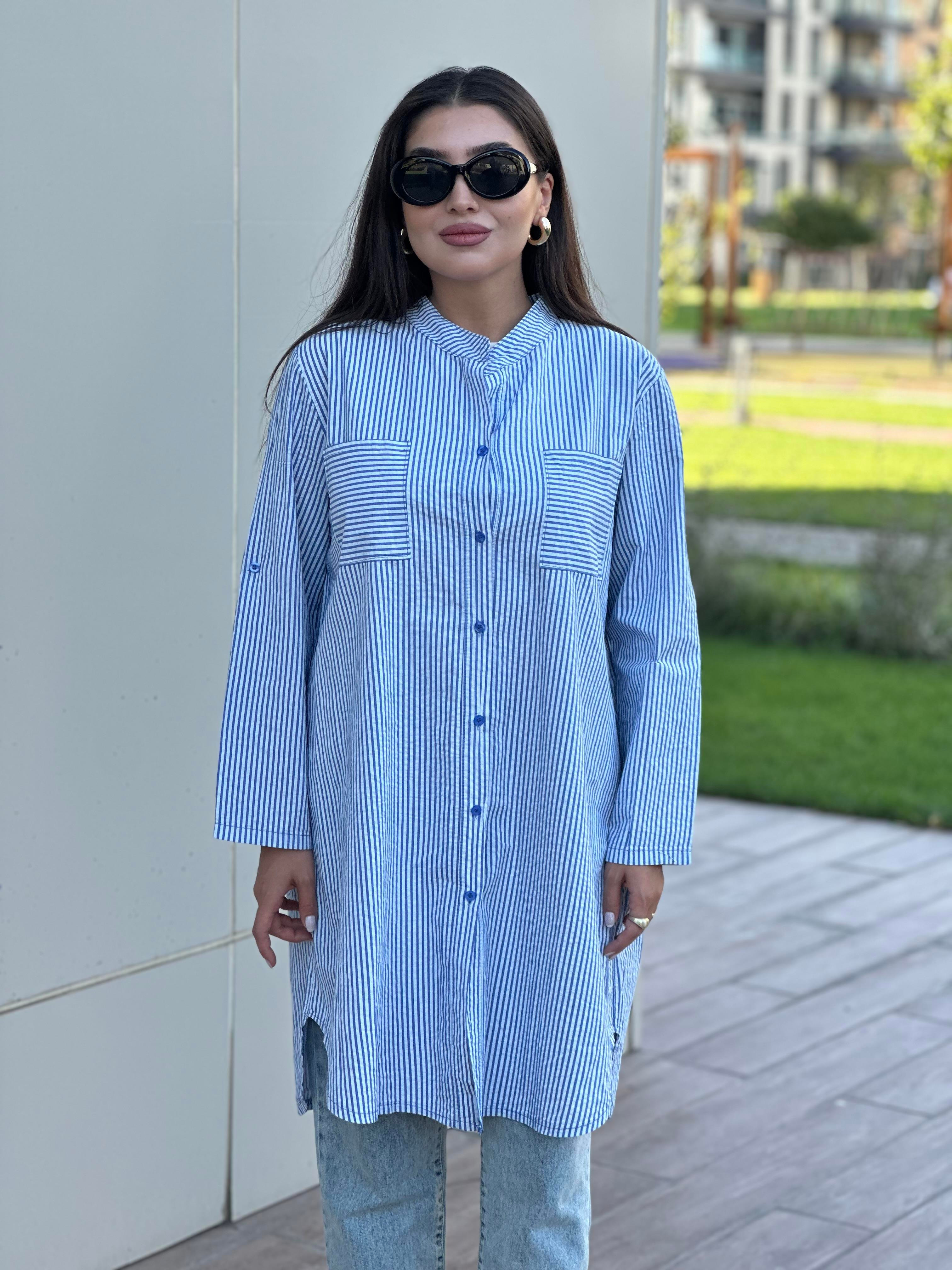 Çizgili Hakim Yakalı Tunik Gömlek Mavi